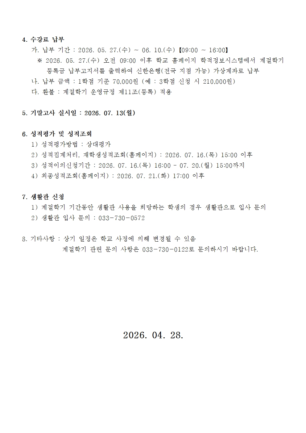 2026학년도 하계 계절학기 수강신청 기간 안내