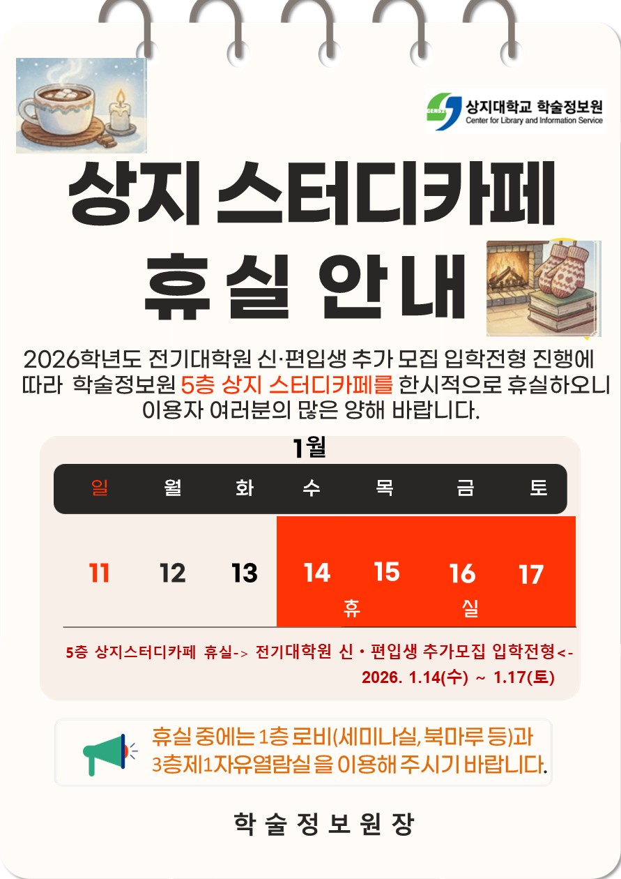 [학술정보원]상지스터디카페 휴실 안내(전기대학원 신.편입생 모집 입학전형)