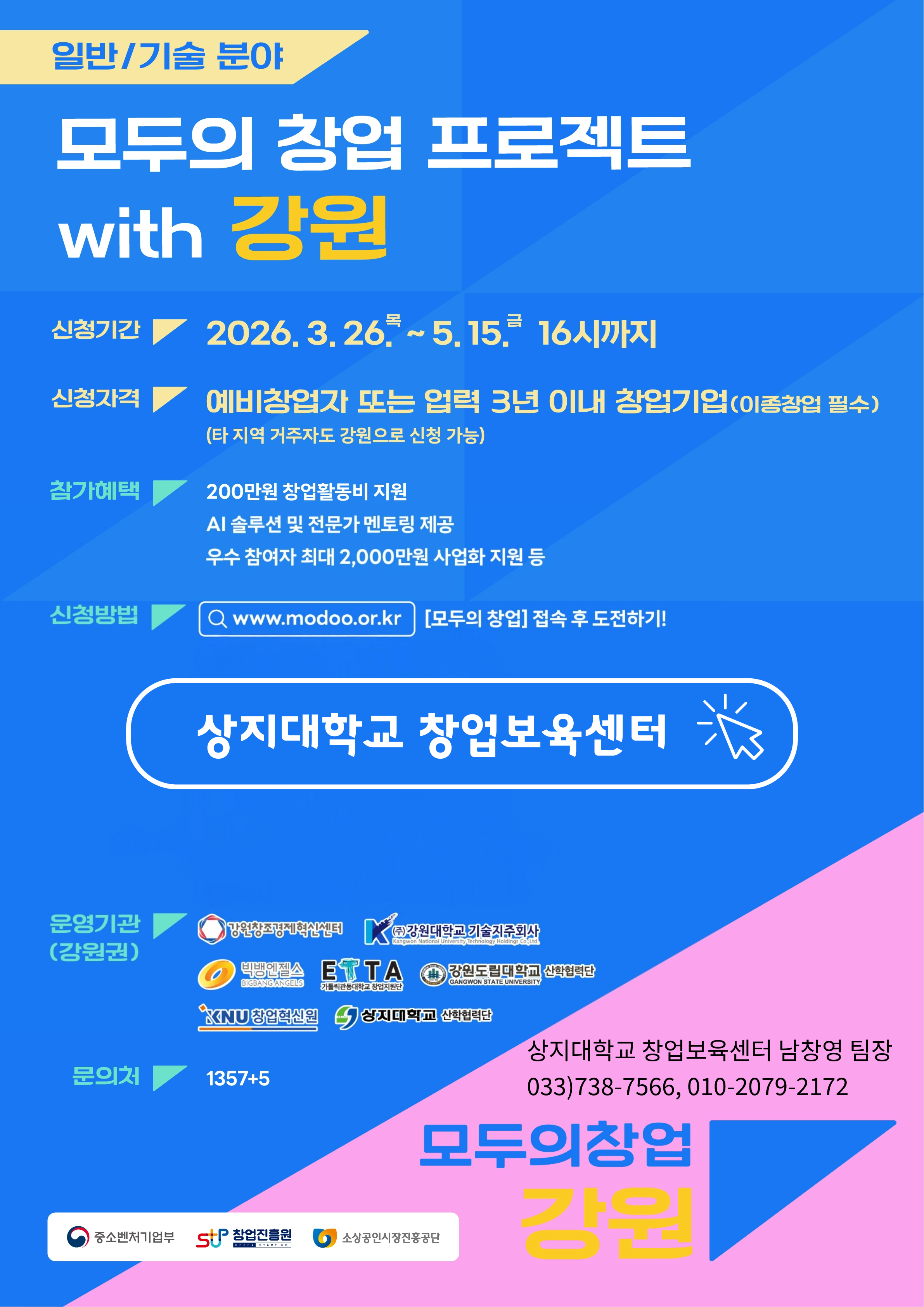 * 문의 : 상지대학교 창업보육센터 남창영 팀장 033)738-7566, 010-2079-2172