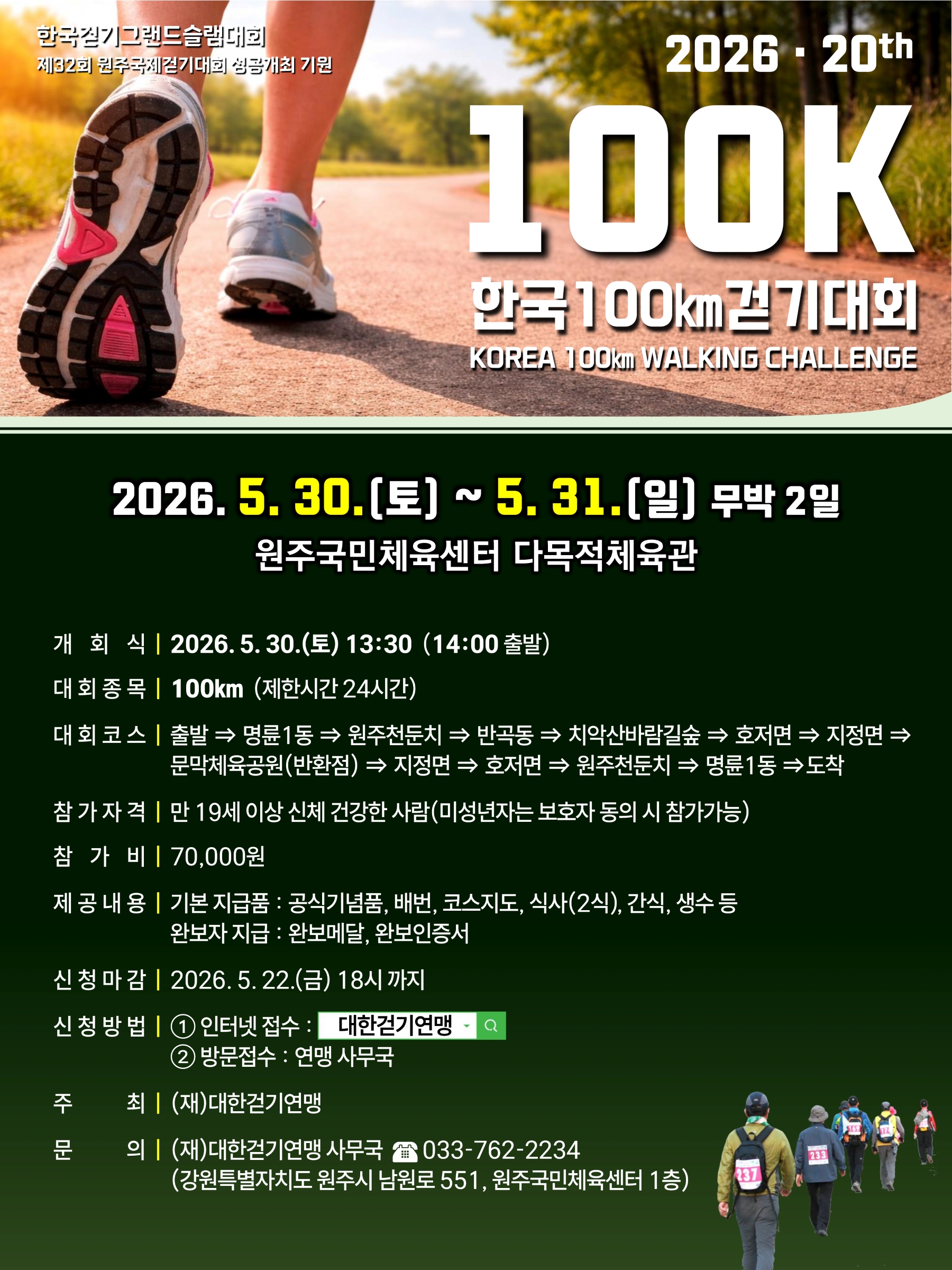 2026 제20회 한국 100KM 걷기대회 참가 신청 안내