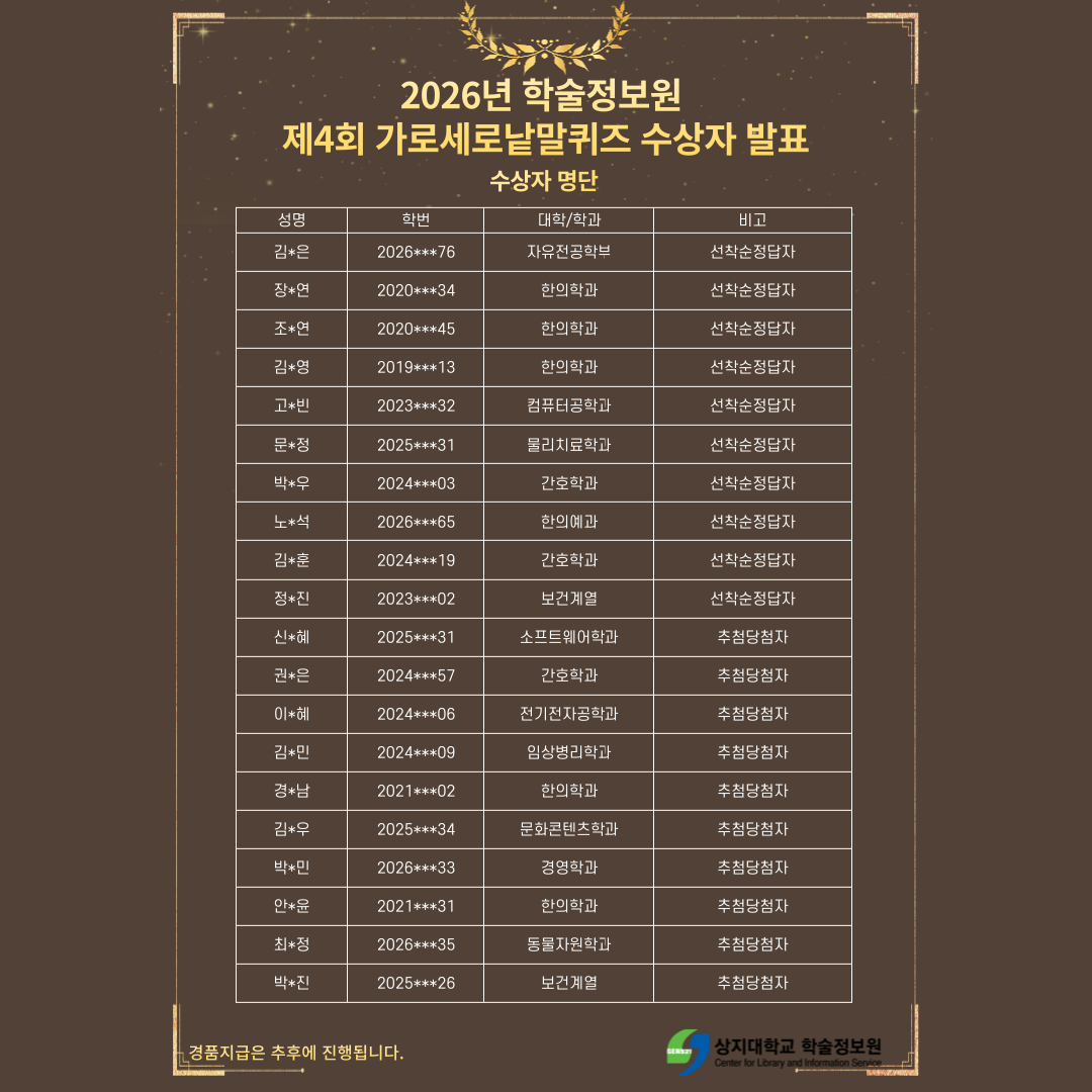 2026학년도 학술정보원 제4회 가로세로 낱말퀴즈 당첨자 결과 발표