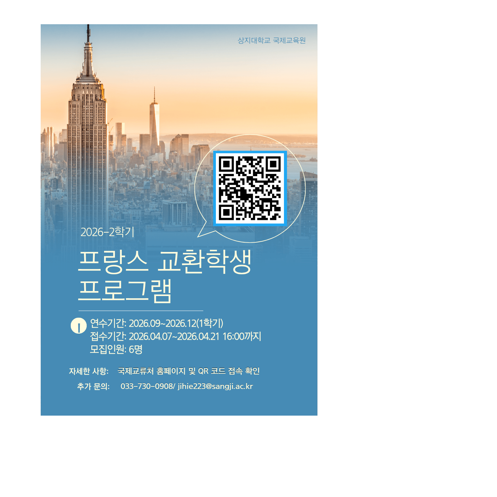 자세한 사항은 아래 포스터속 QR코드 또는 국제교류처 홈페이지 공지사항을 확인해주세요.