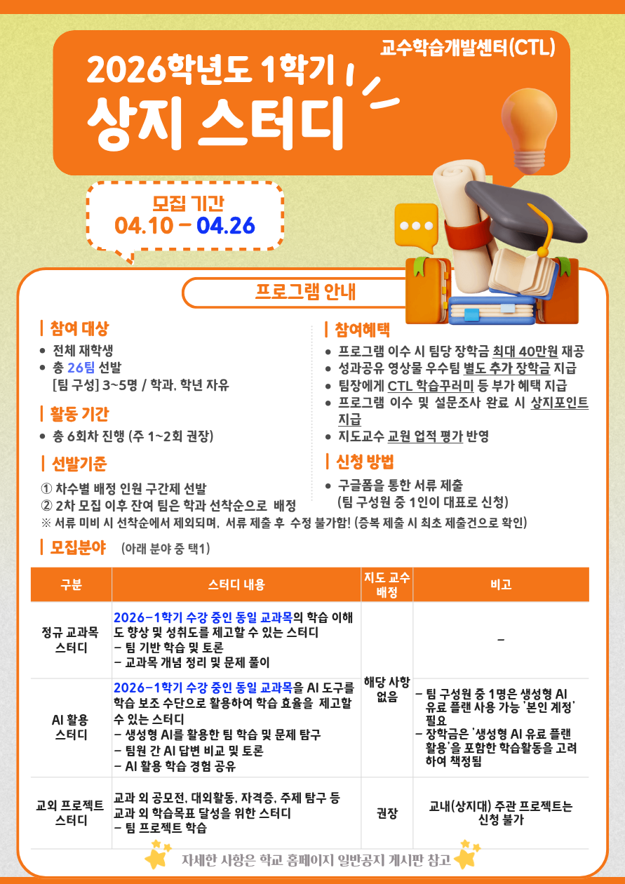 2026학년도 1학기 상지 스터디 프로그램 참여팀을 추가 모집합니다.<~2026.04.26.(일)까지>