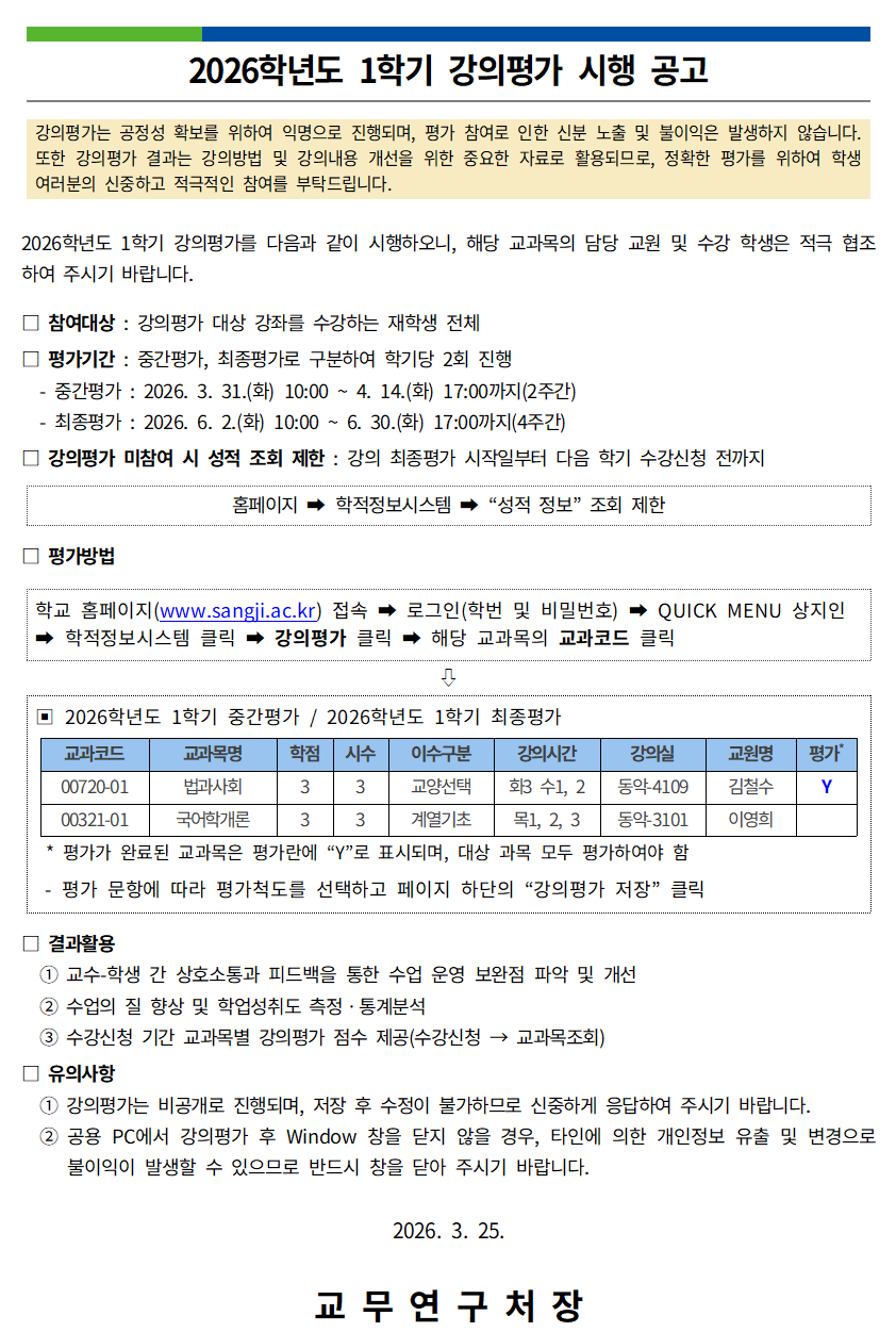 2026학년도 1학기 강의평가 시행 공고