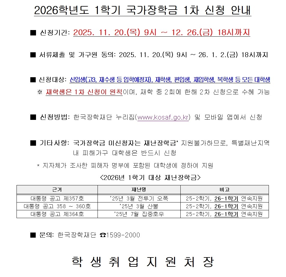 [국가장학] ★2026학년도 1학기 국가장학금 1차 신청 안내★