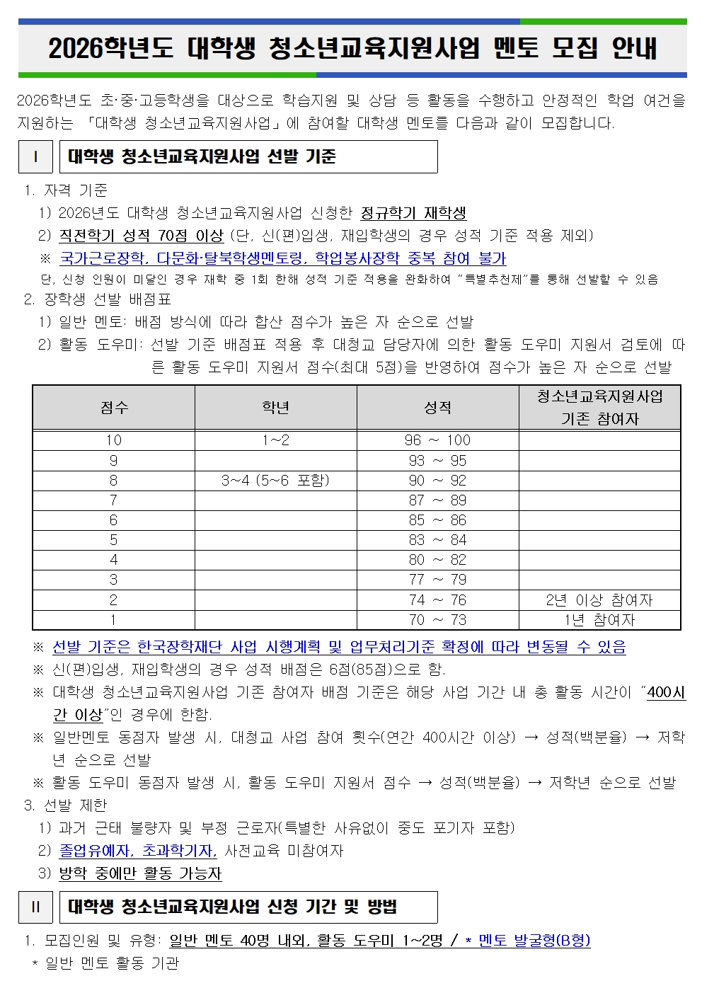 [대청교] 2026학년도 대학생 청소년교육지원사업 멘토 모집 안내