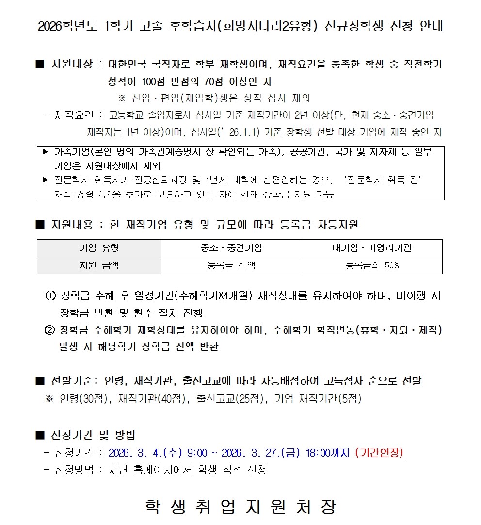 (기간연장) [희망사다리] 2026학년도 1학기 고졸 후학습자(희망사다리2유형) 신규장학생 신청 안내