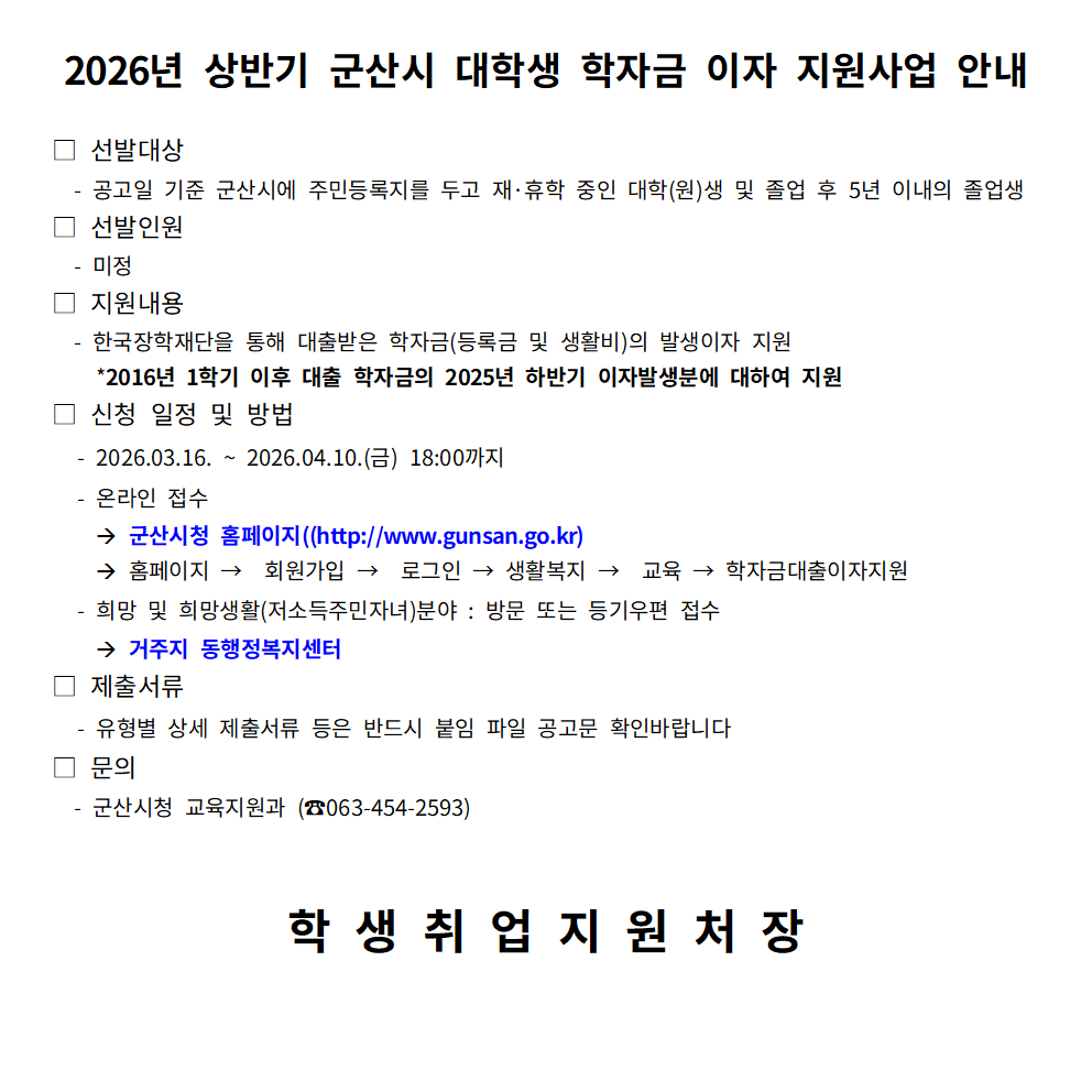 [공고]2026년 상반기 군산시 대학생 학자금 이자지원.hwp [119.5 KB]