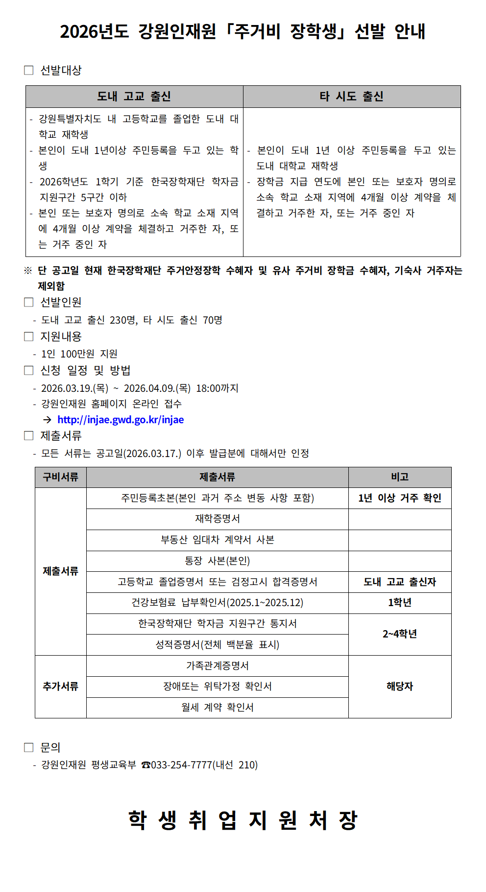 [교외장학] 2026년도 강원인재원 「주거비 장학생」 선발 안내