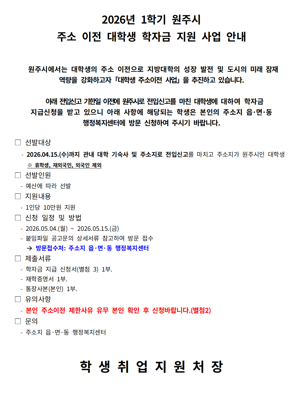 [교외장학] 2026년 1학기 원주시 주소 이전 대학생 학자금 지원 사업 안내