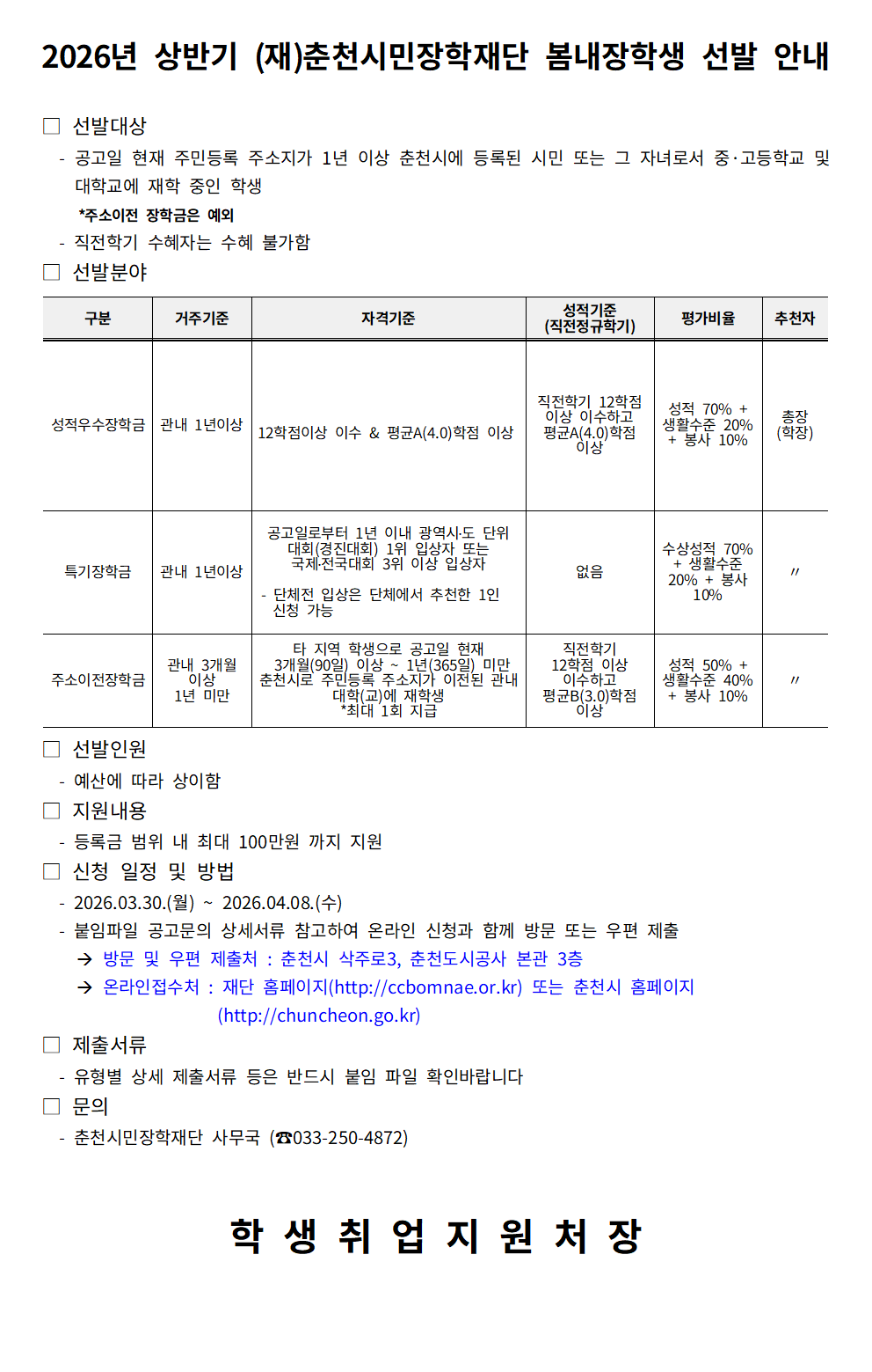 [교외장학] 2026년 상반기 (재)춘천시민장학재단 봄내장학생 선발 안내