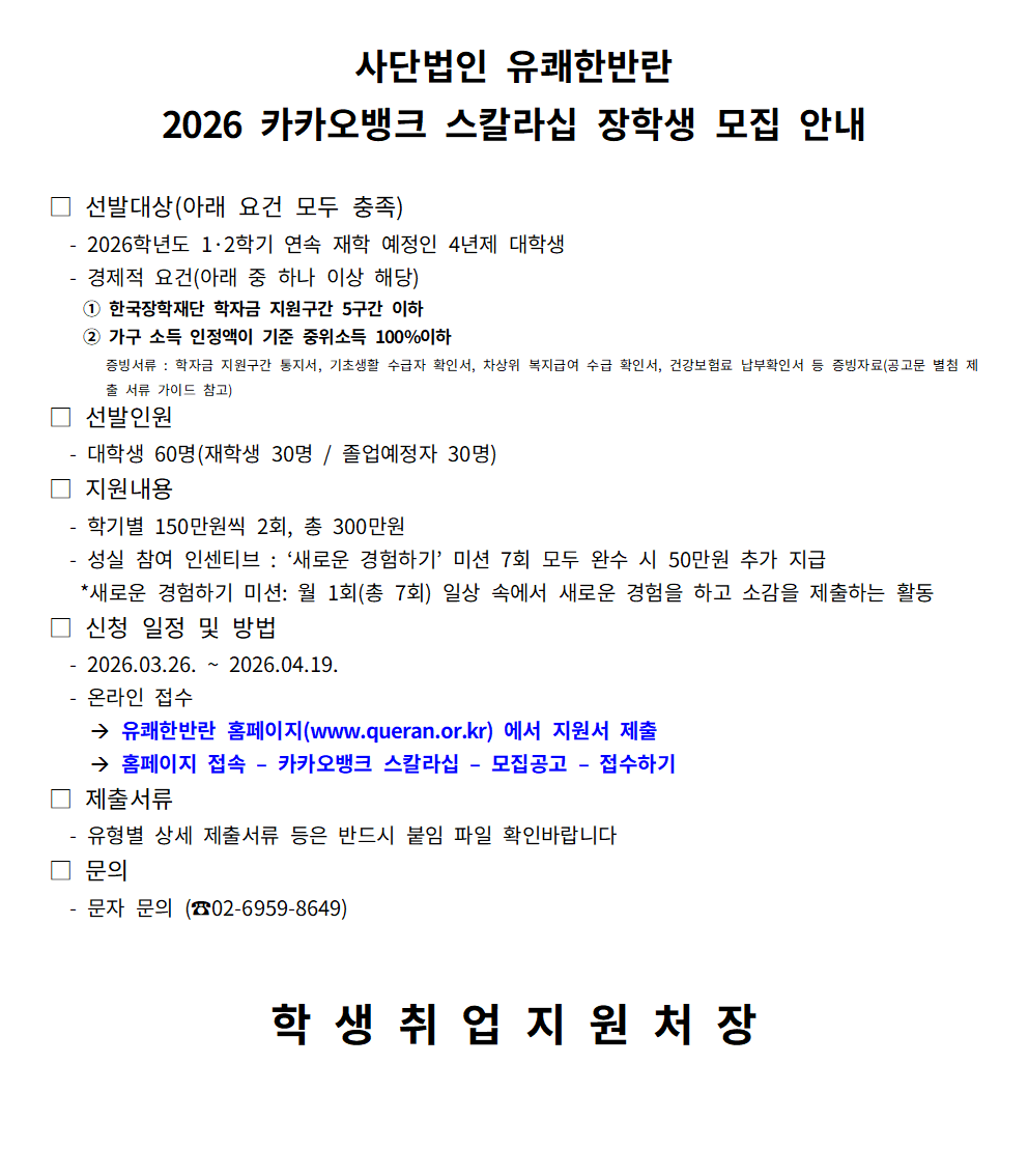 [교외장학] 사단법인 유쾌한반란 2026 카카오뱅크 스칼라십 장학생 모집 안내