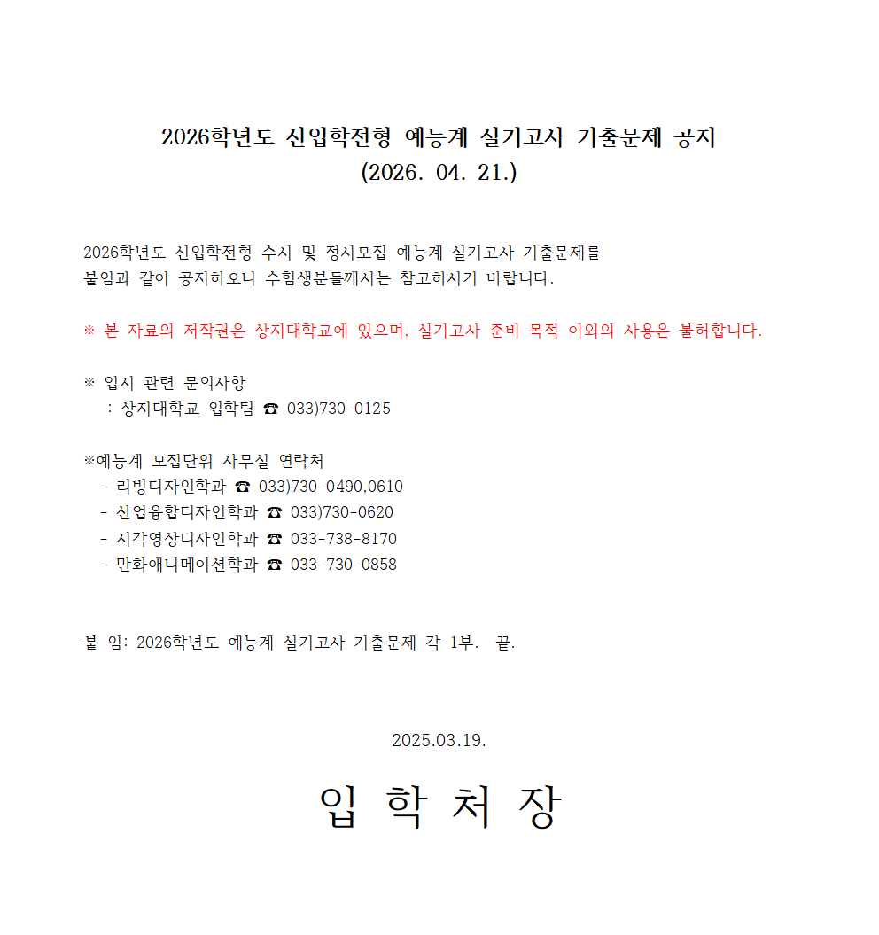 2026학년도 예능계 실기고사 기출문제를 붙임과 같이 공지합니다.