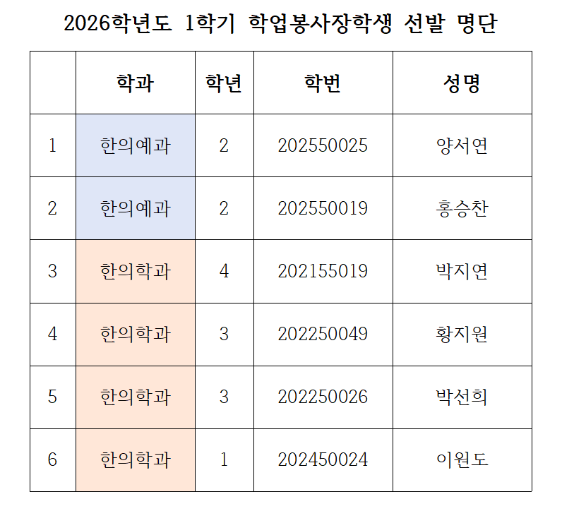 <2026학년도 1학기 학업봉사장학생 선발 명단>