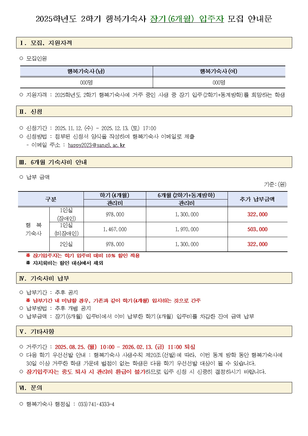 2025학년도 2학기 행복기숙사 장기(6개월) 입주자 모집 안내 [행복기숙사]