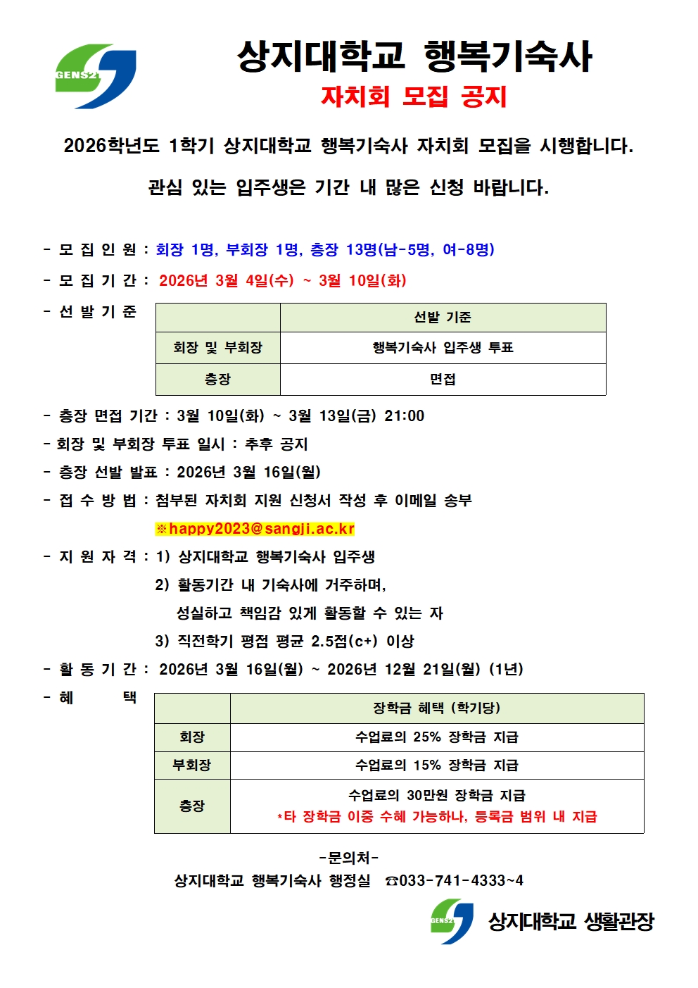 2026학년도 1학기 행복기숙사 자치회 모집 안내 [행복기숙사]
