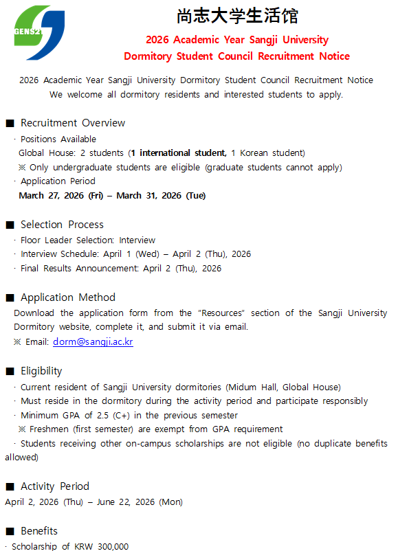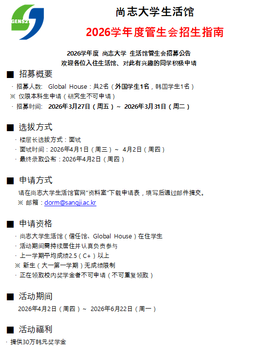 生活馆楼层长申请表(Application Form for Dormitory Floor Leader) [글로벌하우스]
